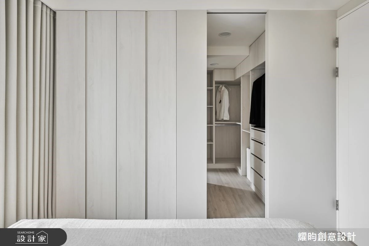 原本建商規劃的主臥空間及浴室,無法滿足屋主夫妻的需求,所以在客變時期,就把原本不符合使用習慣的四件式衛浴撤掉,重新定義水區的位置,再重做防水隔間、引導清晰的 L 型動線,來規劃完整的更衣室、乾濕分離浴室,新增步入式更衣室實現屋主的夢想,提升生活品質,美感與實用兼備。