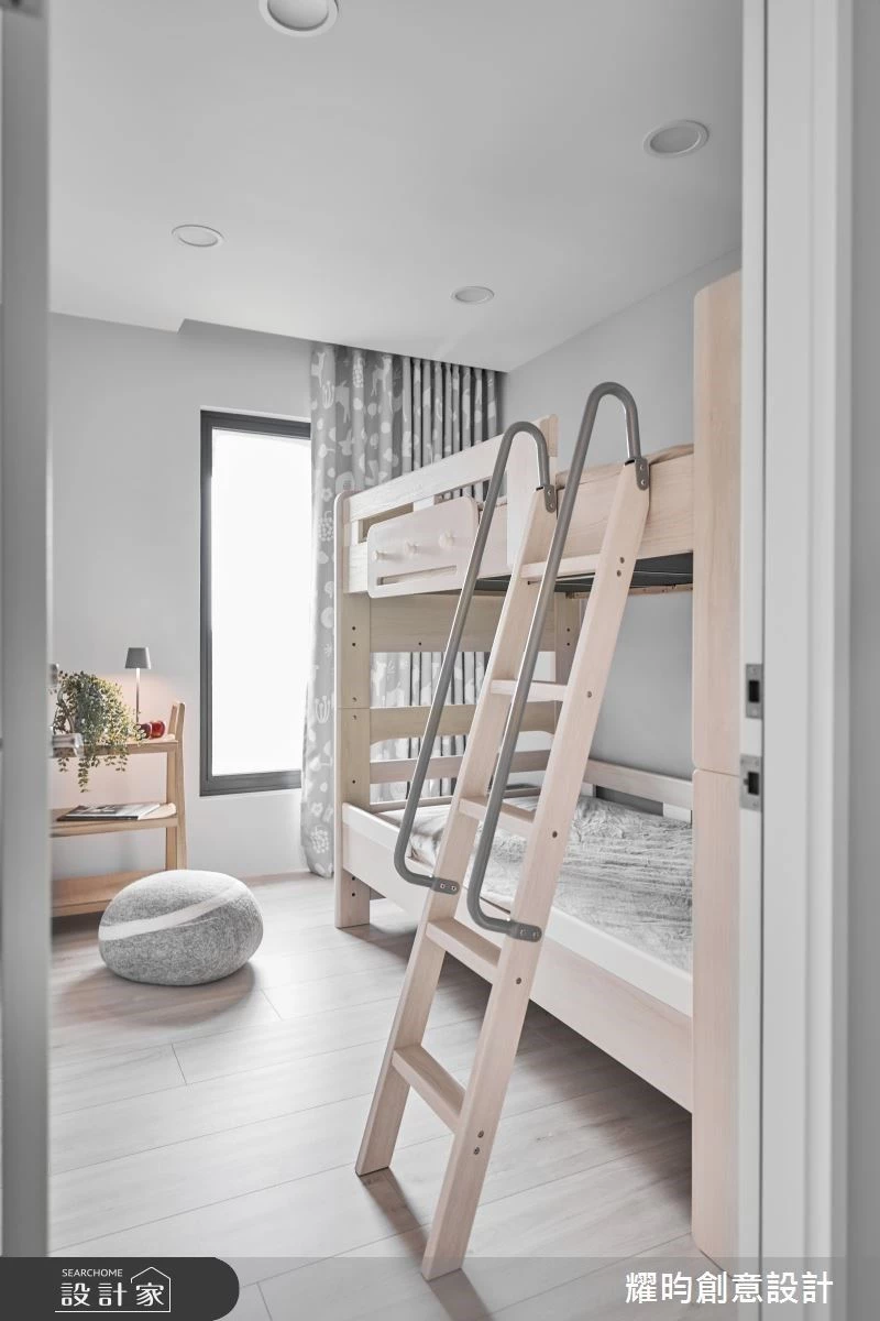 除了主臥以外,原本建商還預留了兩間房間,但由於兩位女兒尚小,習慣一起睡覺,兩間臥室不符合現階段使用,反而顯得多餘,於是改為兒童房與遊戲室。兒童房考量到屋高充足、空間有限,因此選擇雙層床架的上下舖,來培養手足之情。遊戲室則維持空間彈性,等到女孩們長大後,可以作為另一間小孩房使用,方便一家人按照不同的人生階段,去微調空間的具體功能。室內準確分配預算,公領域變得親子皆宜,私領域又符合各個成員的需求,讓單調預售屋改造成一家四口的溫馨親子宅。