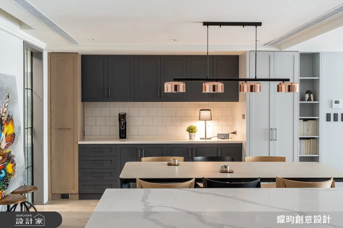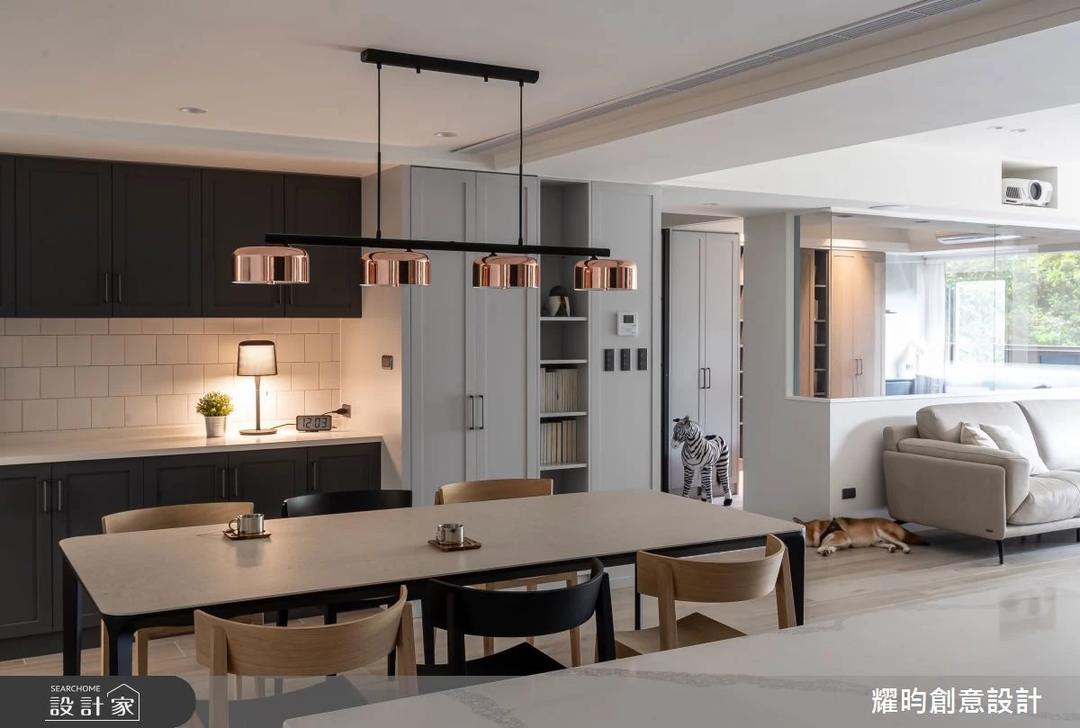 為了落實歐美住宅無動線設計,設計上揚棄了傳統獨立的收納概念,將玄關櫃與室內的備餐櫃巧妙地整合為一體,不僅提升了使用的便利性,更有效地釋放出熱炒區的空間。為了阻隔烹飪時油煙逸散至客廳,內廚增設了玻璃鐵件拉門。設計師更充分利用過道空間,規劃了一座多功能中島,為家人創造了另一個交流互動的核心區域,無論是日常早餐、家庭聚會或款待賓客,都可以在中島與餐桌之間輕鬆進行。除了固定的生活機能外,更針對屋主個人化需求,將中島與琴房整合,也貼心地為寵物狗規劃了一個舒適的小窩。這樣的設計擺脫了傳統隔間的限制,在開放流動的空間中,創造出豐富多元的生活機能。