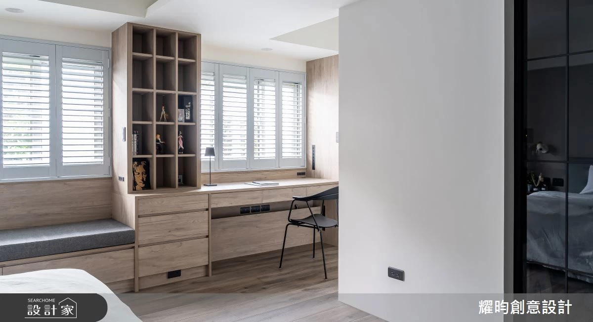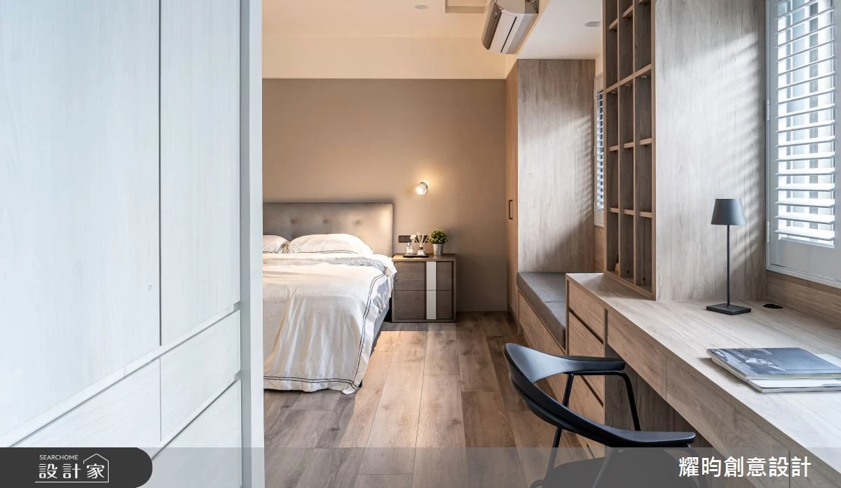 格局調整後,主臥空間更顯寬敞,床鋪置中擺放後,兩側仍保有舒適的走動空間。採光良好的窗邊,運用木作訂製整合了臥榻、書桌與衣櫃,為夫妻倆打造了一個專屬的小起居室。透過帶框百葉窗的設計,不僅美化了老屋原有的鋁窗,也能隨心所欲地調整室內光線,將戶外的自然景致巧妙地融入臥室空間。床尾的空間則貼心地區分為兩個區域,一邊是為男主人打造的專屬閱讀書房,另一邊則是女主人夢寐以求的步入式衣帽間,將夫妻二人的衣物分開收納,讓日常生活更加便捷有序。