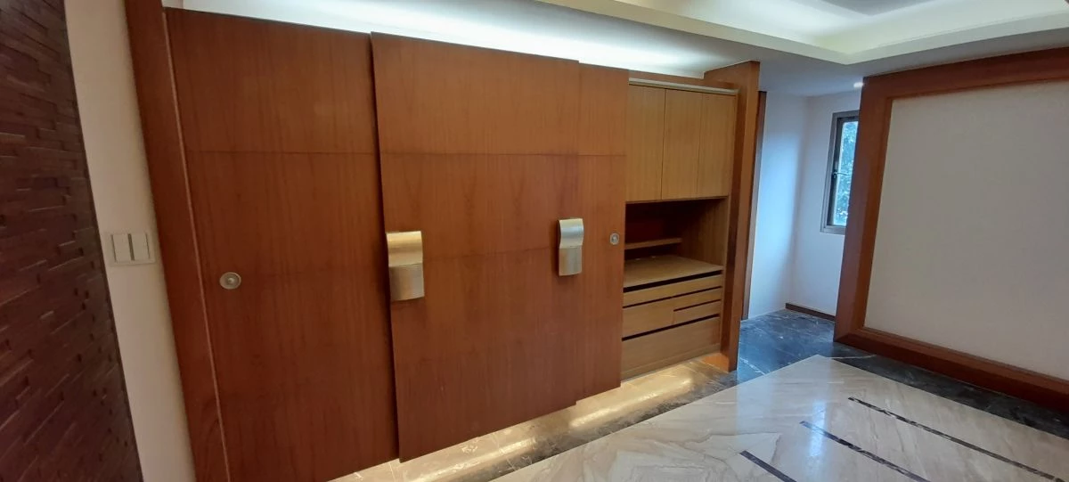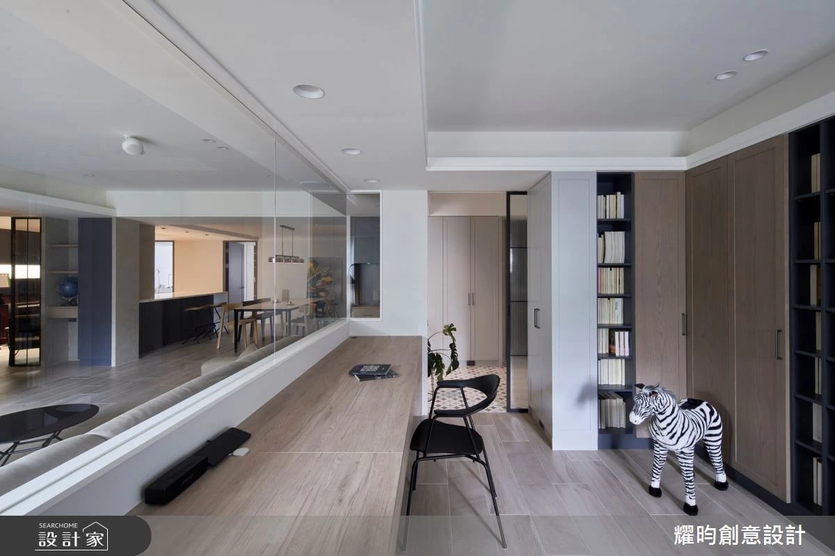 原本過大的迎賓玄關透過一道長虹玻璃拉門巧妙地劃分出一個獨立且開闊的書房,70坪空間規劃5+1房,不僅維持每個房間的坪數的舒適度,特別的格局規劃也維持公領域的開闊感。書房與客廳之間採用了半截式的玻璃帷幕設計,這項改動不僅串聯了兩個空間,更讓自然光線與視線得以自由穿梭,營造出一個通透明亮、毫無阻礙的居住環境。內部整面牆的書櫃足以容納屋主豐富的藏書,替喜愛閱讀的男屋主創造一個專屬的舒適休憩空間。