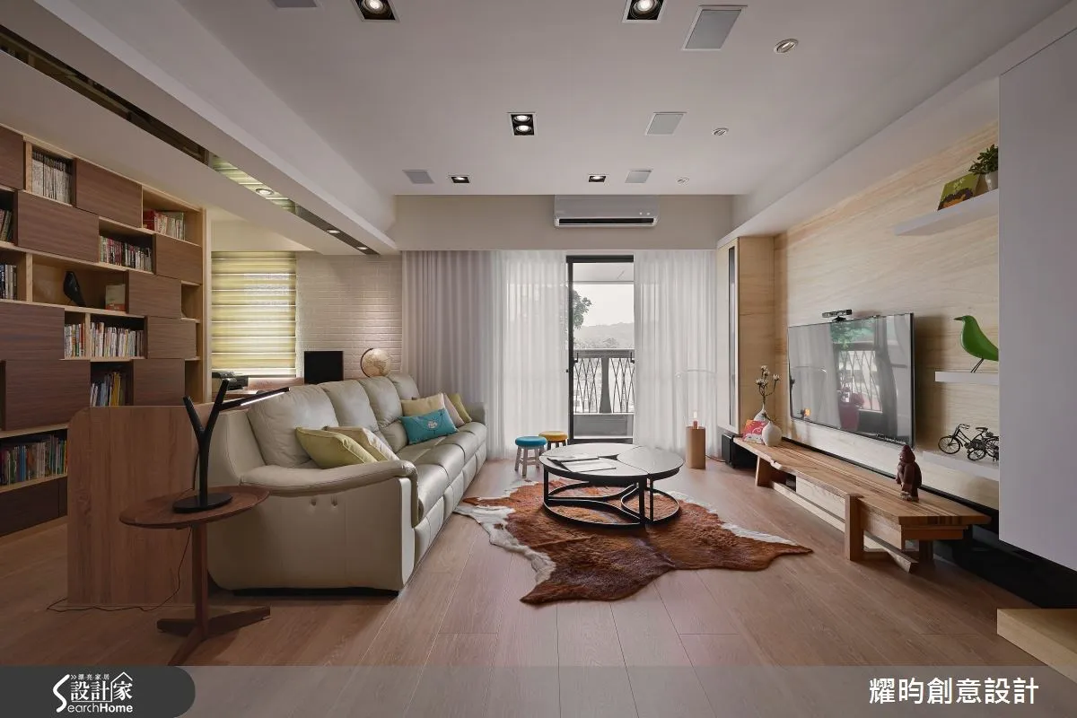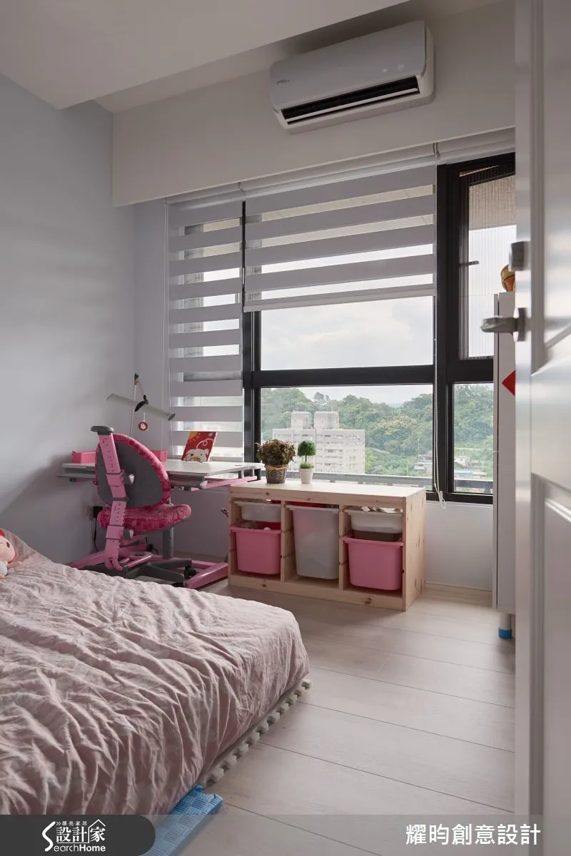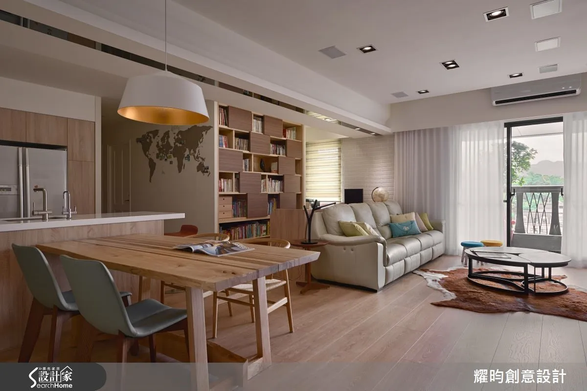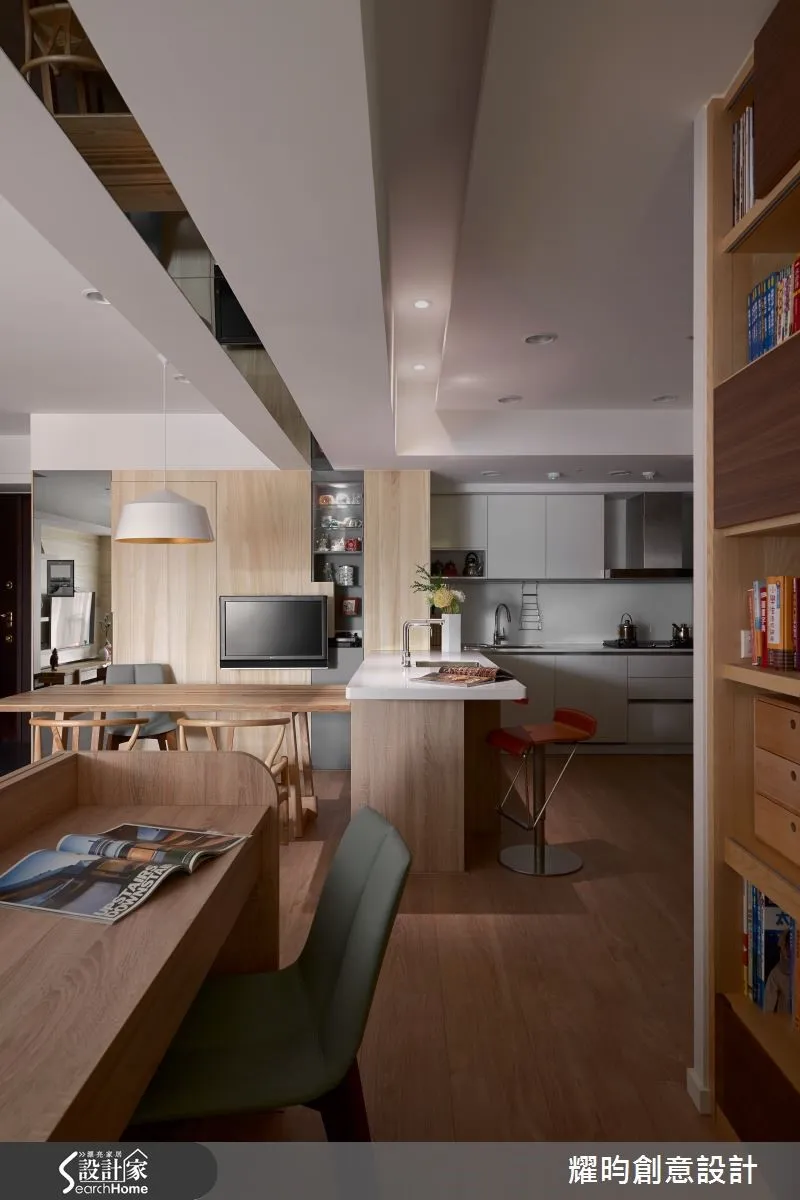 在空間底調上,設計師加入大量木材質,營造休閒放鬆的整體調性,並拓大公領域範圍,讓書房、客廳、餐廚等相互連貫,藉由落地窗挹注豐沛採光、造就寬敞明亮的相聚場合,同時在白色、木質背景之下,搭襯色彩繽紛的家飾擺件、地圖壁貼等,營造具童心感的溫馨氛圍,電視牆則加入懸吊櫃體與展示架設計,透過精心策劃的量體安排與切割比例,架構美觀實用的立面表情;書房後方則規劃造型櫃體,透過方塊木板材的穿插變換,與書籍色彩錯落相間,帶出豐富的視覺層次;並改造原先封閉的廚房設定,連結餐桌與吧檯,構成開放用餐領域,讓家人的互動關係更為融洽緊密;臥房則採粉紅色彩植入居者個性,並藉窗景連結室內外視野,讓人放眼望去,即可感受到綠意山景的美好!