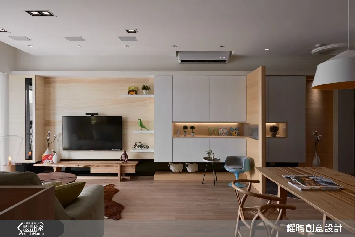 34 坪居宅,設計師拆除既有廚房隔間,給予開闊的公領域範圍,並大量運用木質營造冬暖夏涼的悠閒氛圍,同時揉入裝飾品帶出童趣感,使空間洋溢著溫暖、活潑的生活質韻,快跟著小編一起走進來看看吧!