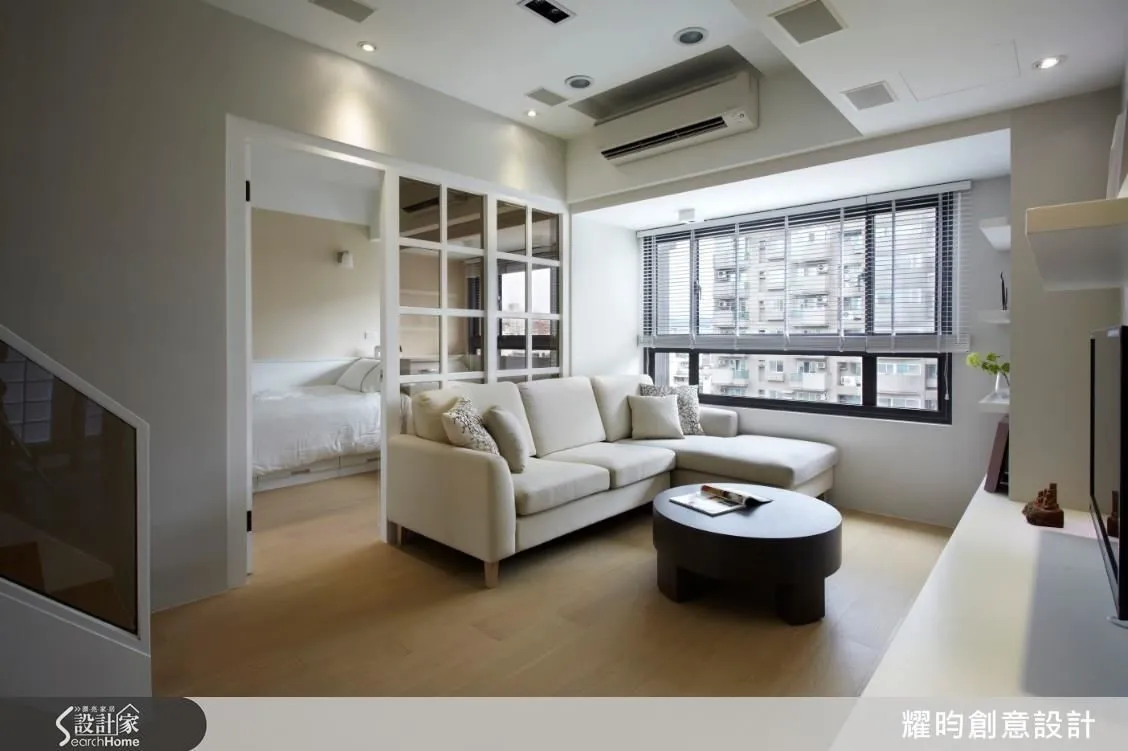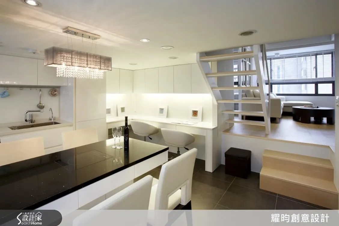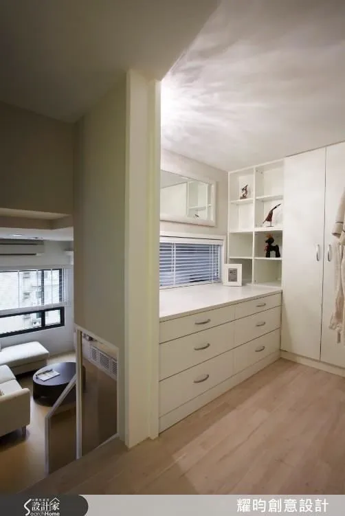 善用 4 米 2 的挑高優勢,為 20 坪夾層創造通透明亮的空間用度,更以純白色調帶來清爽放鬆的休閒氣息,巧妙錯層設計則創造充裕的活動與收納動線。
