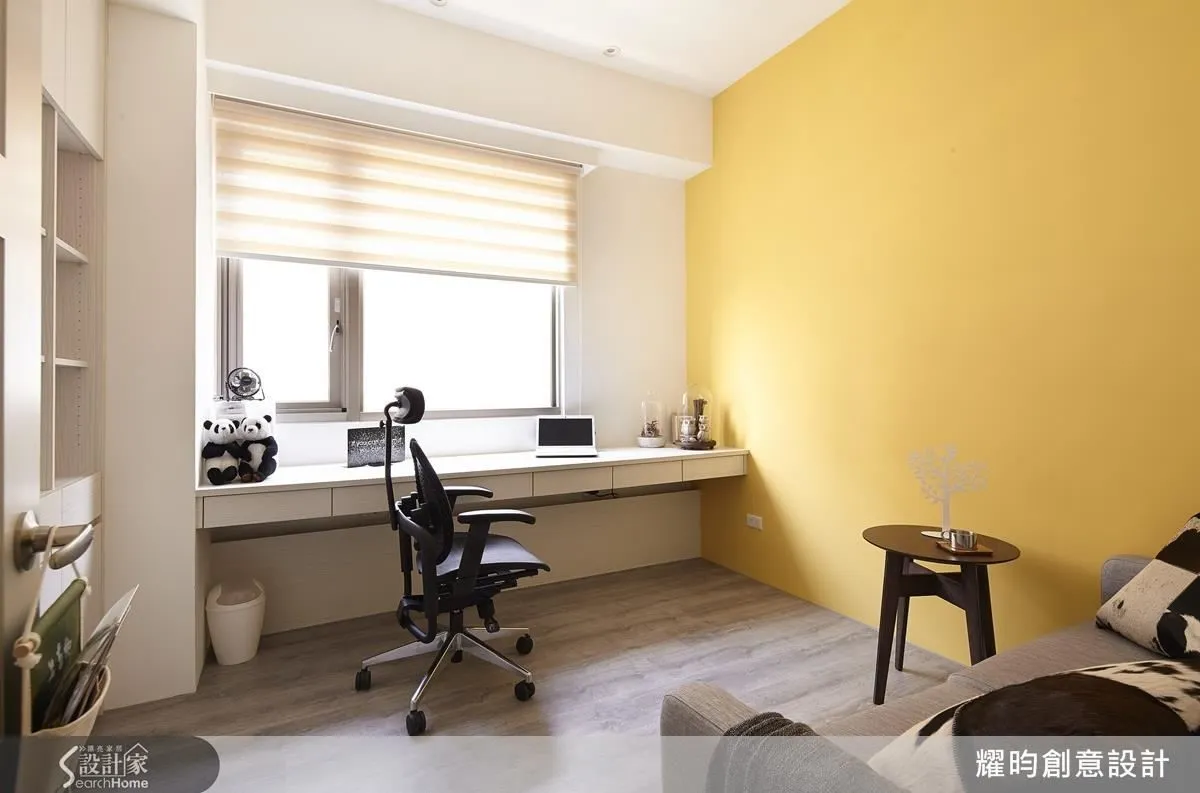 書房牆面以鮮黃色調作為視覺亮點,搭配窗邊書桌與布面沙發,就成為夫妻倆可以隨興放鬆的自適空間。