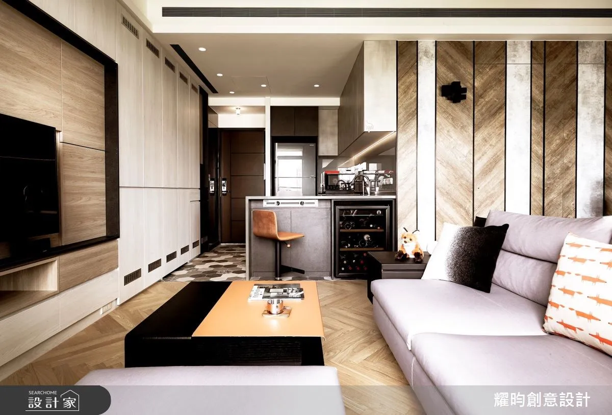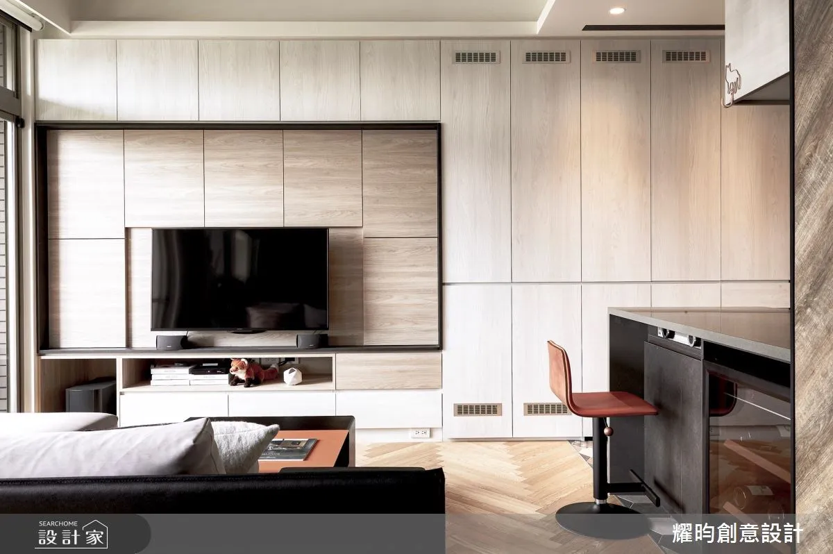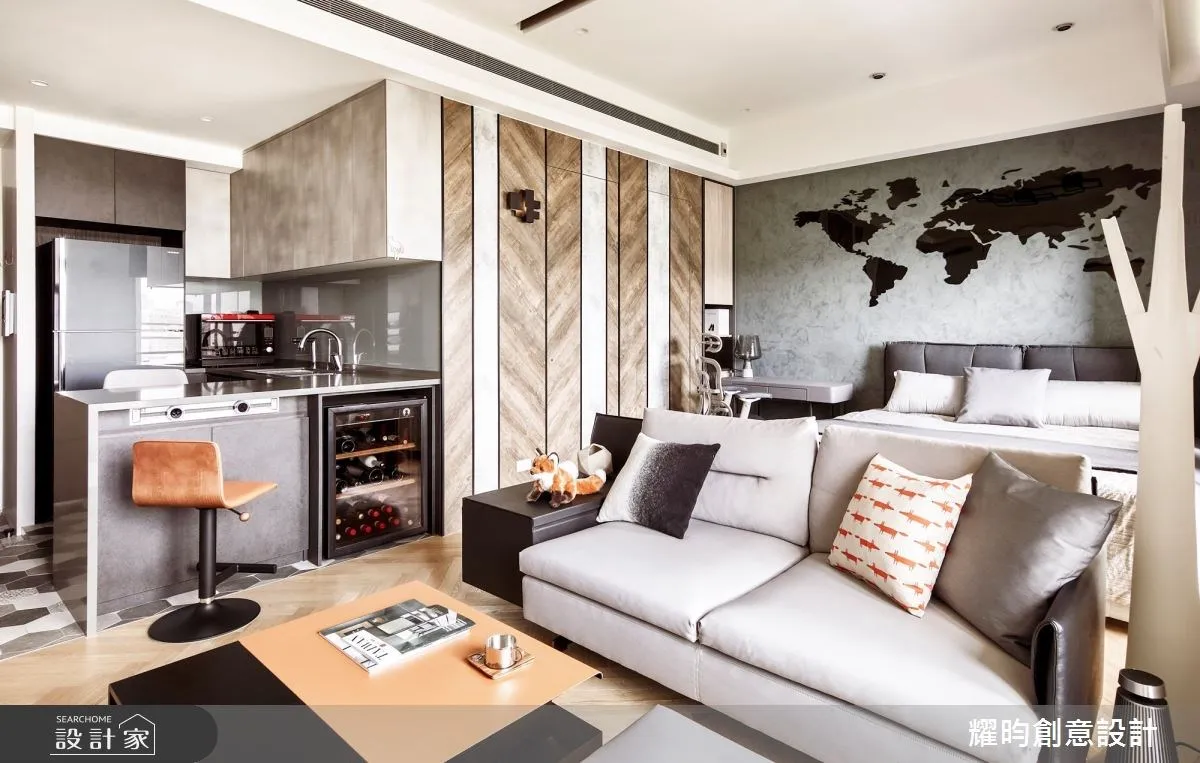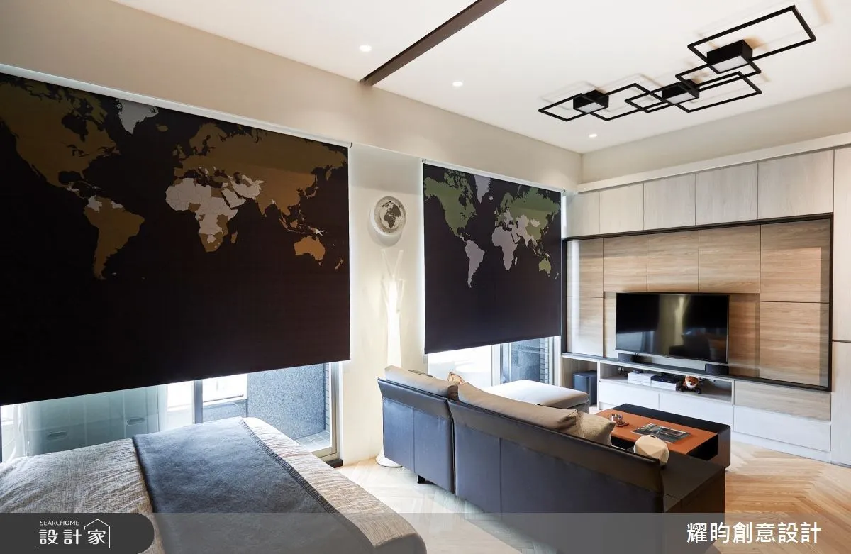 客廳與臥室鋪設人字拼海島型木地板,帶來北歐風的溫暖質感,而電視牆巧妙運用板材的色澤變化,劃分出獨立的機能形式。另外,臥室採取開放式設計,床頭牆藉由特殊塗料勾勒出世界地圖的造型,也成為整個空間的視覺焦點。一旁的木紋牆面隱藏衛浴空間,減少門片造成的視覺干擾,營造空間的完整性。