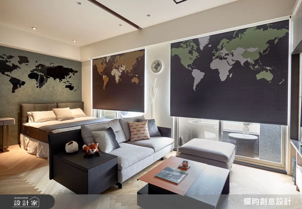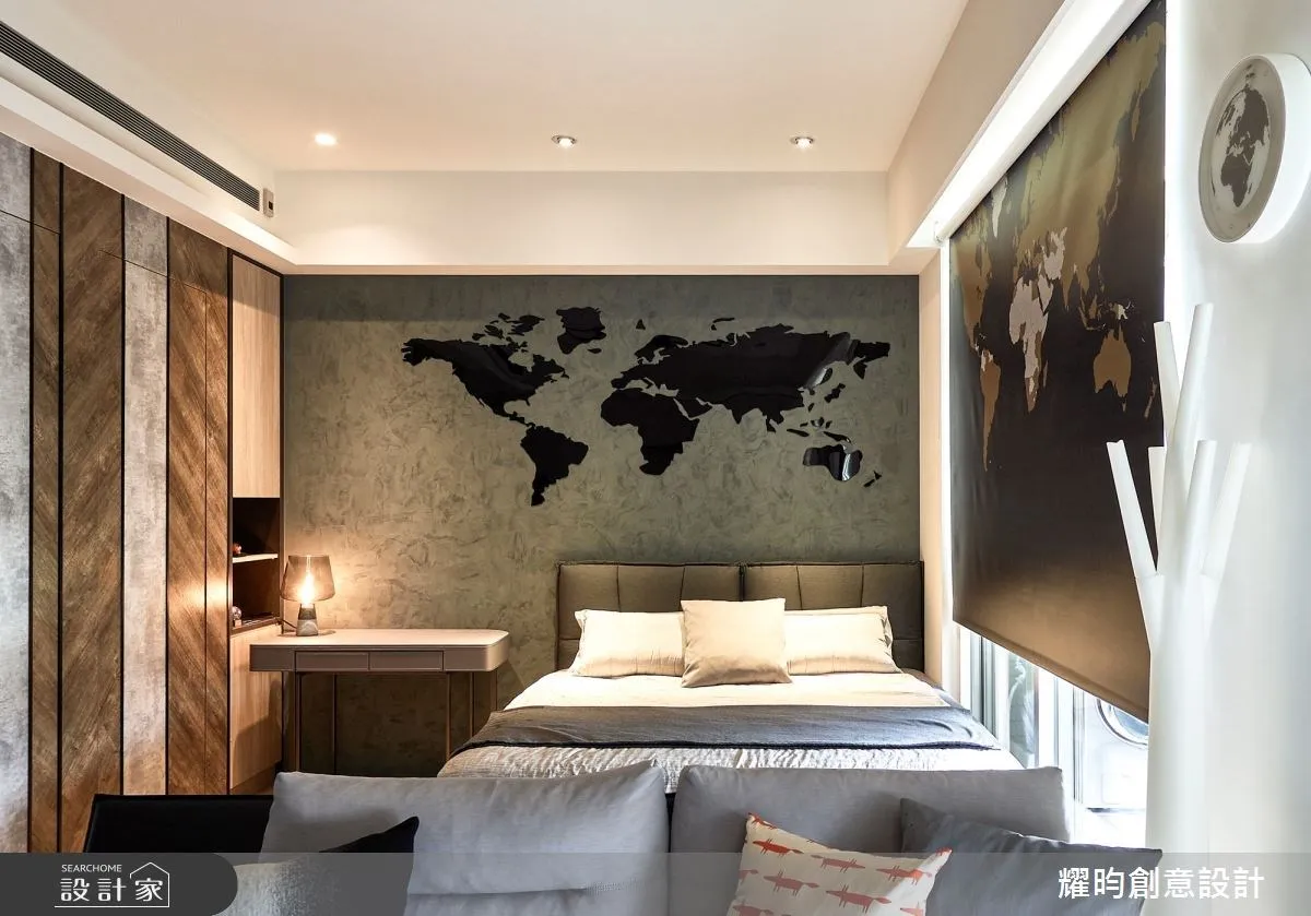 除了床頭牆有世界地圖元素之外,窗簾與時鐘都呼應了這個空間主題,即便室內不大也能有全世界盡收眼底的遼闊感。