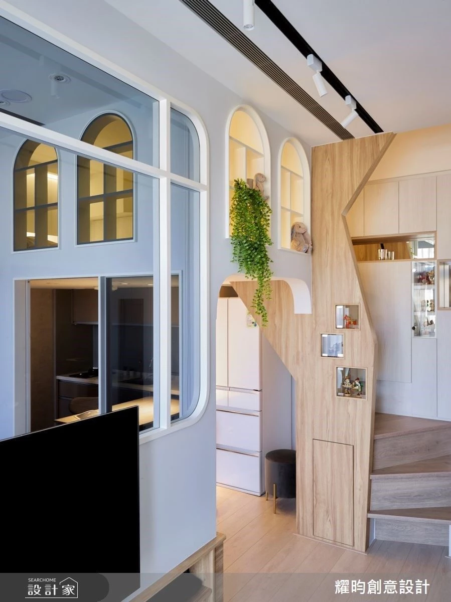 整體以大量的白色調為基底,局部透過灰、黑妝點空間,增添立體視覺線條,且搭配木紋肌理的材質,調和出簡約、溫潤的北歐風空間。電視牆同時兼具客廳與書房的隔間,壁面以玻璃材質、圓弧形窗景為意象,且延伸出二樓的立面造型,通透的玻璃材質,讓光盈滿室內;書房空間以玻璃拉門界定,可依屋主需求敞開或關閉門扇,門邊利用鐵件層板規劃書牆。餐廚空間整併,流理臺下方結合活動式餐桌,當用餐完畢,可以收整到檯下,讓出開放的廊道作為日常動線。客廳一旁打造木作階梯,蜿蜒的側邊線條宛如樹幹向上延伸,樑下則規劃收納空間,滿足屋主生活的實用機能。