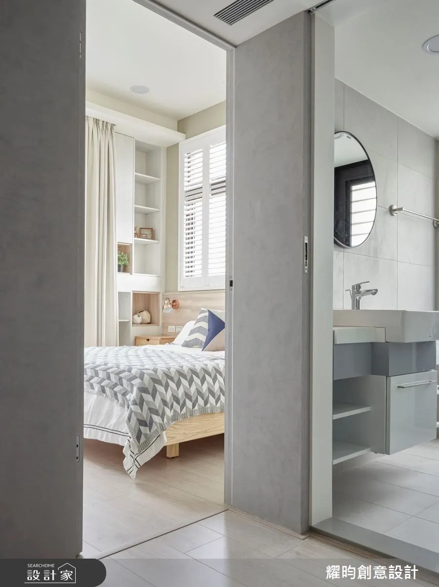 主臥延續公領域的北歐清新感,並增加更多的木質調,來營造溫暖舒適氛圍。而位於走廊底端的衛浴,藉由穿透性高的拉門,讓光線照亮餐廚空間。