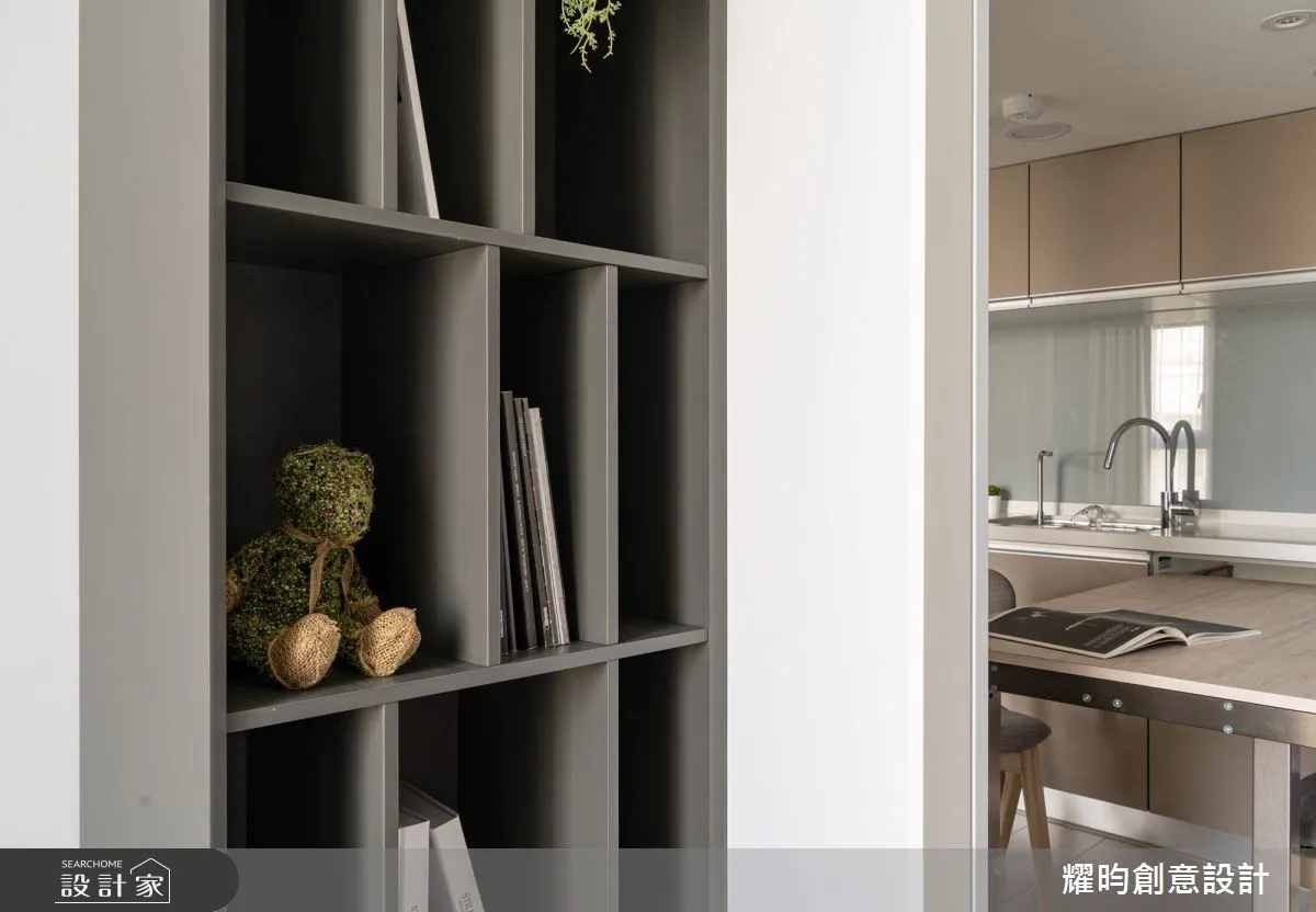 設計師以大面積的白色調,放大室內的空間感,而介於客廳和書房之間的電視牆,除了兼具隔間功能以外,還透過圓弧造型的玻璃窗景,將明亮採光引進各個角落。書房在玻璃拉門旁與窗邊,規劃輕盈的展示櫃,收納書籍及擺飾,給屋主一處悠閒的閱讀區域。
