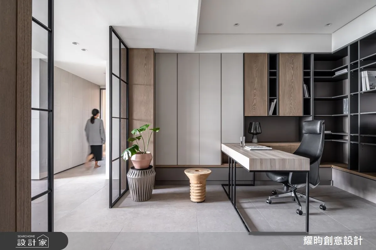 通透玻璃與櫃體重新界定書房分野,層架設計也滿足玄關的收納需求,可供屋主放隨手拿取的日常用品,不僅提升生活上的便利性,更創造出視覺上的景深變化。