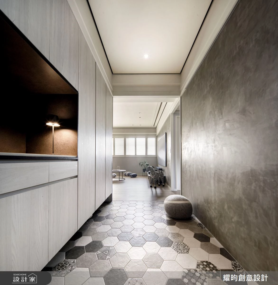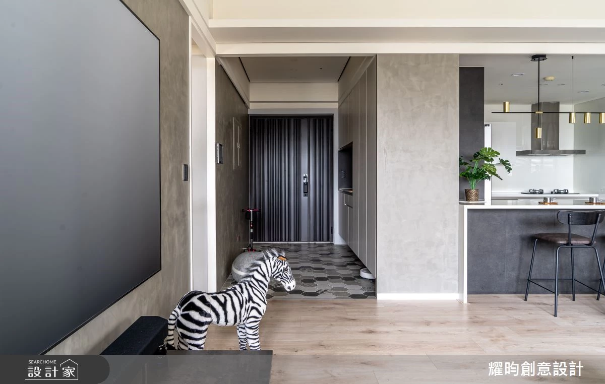 入門玄關處鋪敘灰階六角磚地坪,明確落塵區的同時,更挹注一絲清新活力感,其次設置大面懸空造型鞋櫃,一次滿足生活機能及設計美學。