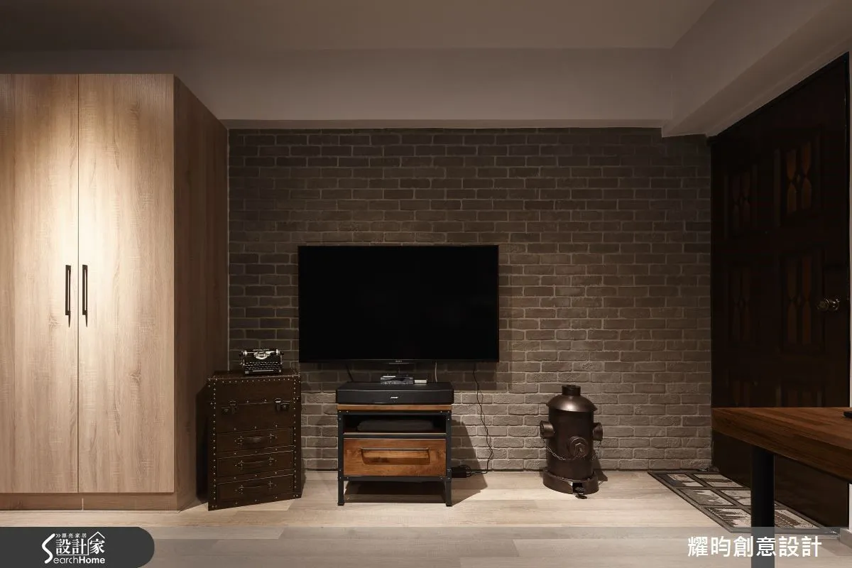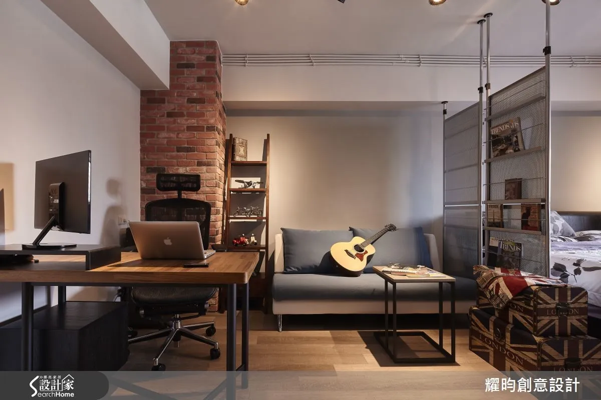 設計師將原來位在左側的廚房移至右側,讓流理檯、冰箱與大衣櫃整合拉齊,動線自然出現,僅僅是將空間重新排列,就換來大尺度的坪效。使用透光的工業風沖洞板作為公私領域的分界,適時遮擋進屋的視線以保有隱私,與刻意保留裸感的紅磚結構柱,型塑一致的粗獷風格。衛浴旁的畸零雨遮空間也被極致利用,作為洗晒衣區,為小窩增加使用坪數。