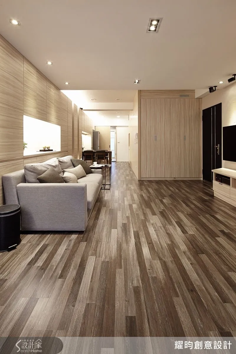 ▲設計師重組格局,將客廳居中,收納櫃安置在屋子的兩側,再以水平同向紋路的地板配合長軸線的走向,避免垂直短促的切割,延伸景深效果,讓空間更為深邃。
