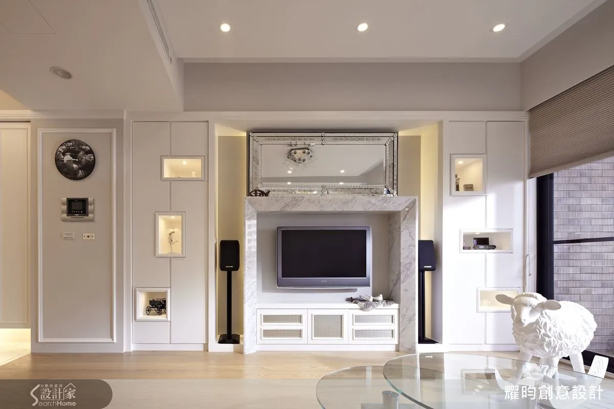 ▲將家具或電視櫃與展示櫃合一,避免突出在空間中,再以線條與格櫃增添視覺變化,讓牆面不會齊線一致而顯得單調。