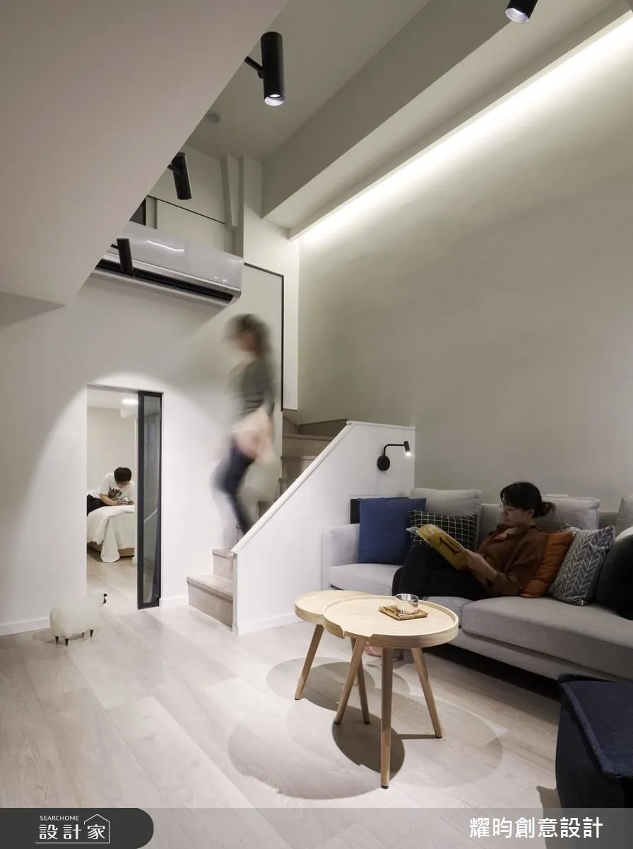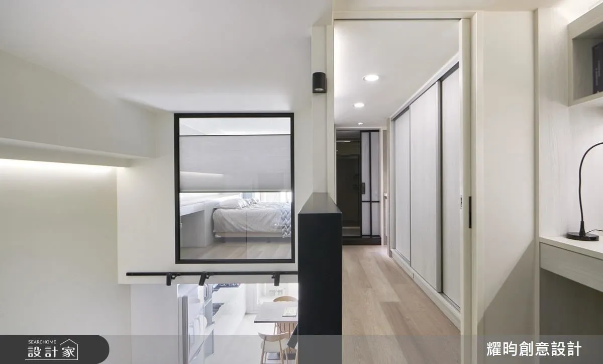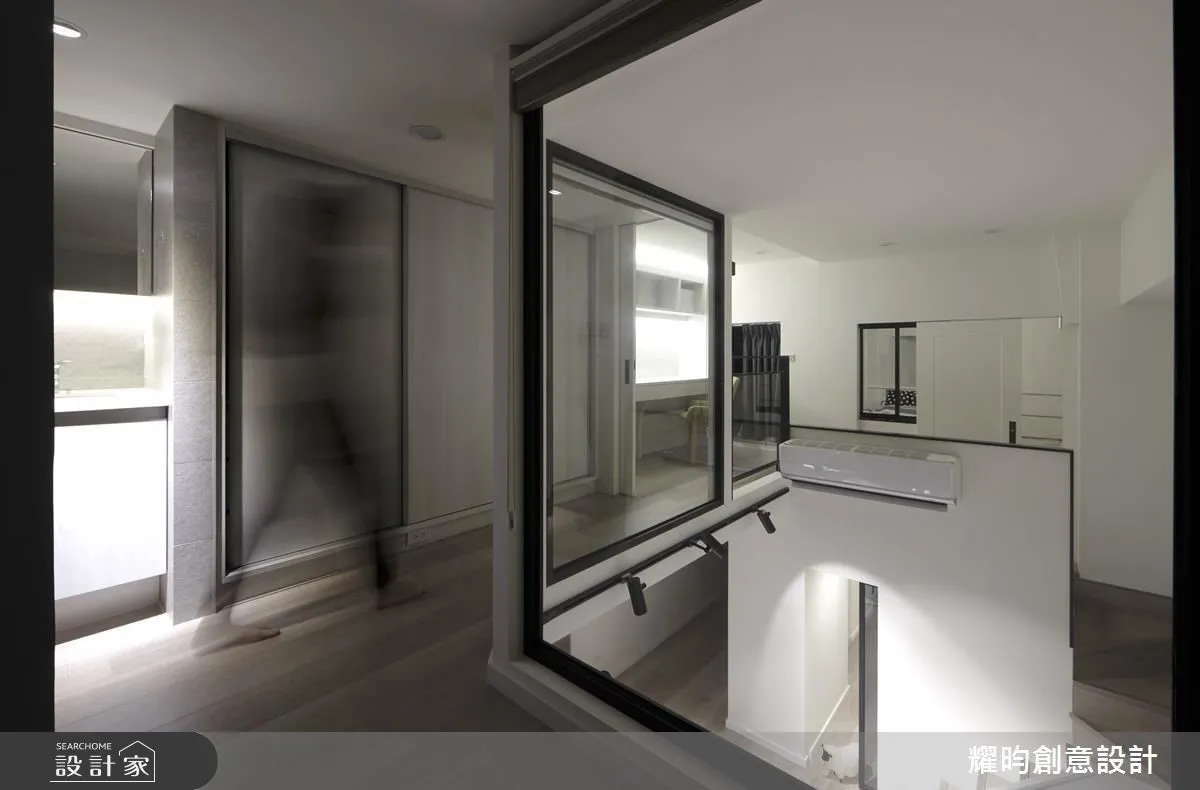 設計師將公領域的客餐廚規劃在平面空間,讓久別的家人得以在此和樂團聚,分享心情;並將樓梯與一房結合,下方作為玄關的廊道,保留充裕的轉寰空間。由於採光面集中於一側,設計師利用玻璃作為各個臥室的隔間,讓採光更易穿透,也讓內部安置的軌道燈等間接照明,充分達到屋主期待的氛圍。上方臥室宛如一個個玻璃燈箱,彷彿懸浮的空中樓閣,雖然坪數有限,但不管休憩、收納、閱讀,充沛的生活機能一樣也不少。