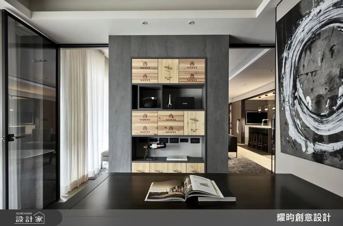 設計師更將屋主的工作、興趣與生活全部融入設計中。屋主有許多來自各地,充滿回憶的紀念品,需要收藏與展示,因此,設計師以色澤質樸的特殊漆作為牆面底色,以造型別致的書架凝聚視覺焦點,不管擺放植栽、書籍或珍藏品,都能襯出特色,相得益彰。設計師更為喜歡品酒的屋主在廚房配置了紅酒櫃,再以紅酒箱當作書房牆面的門板造型,讓書房擁有獨一無二的氣質。