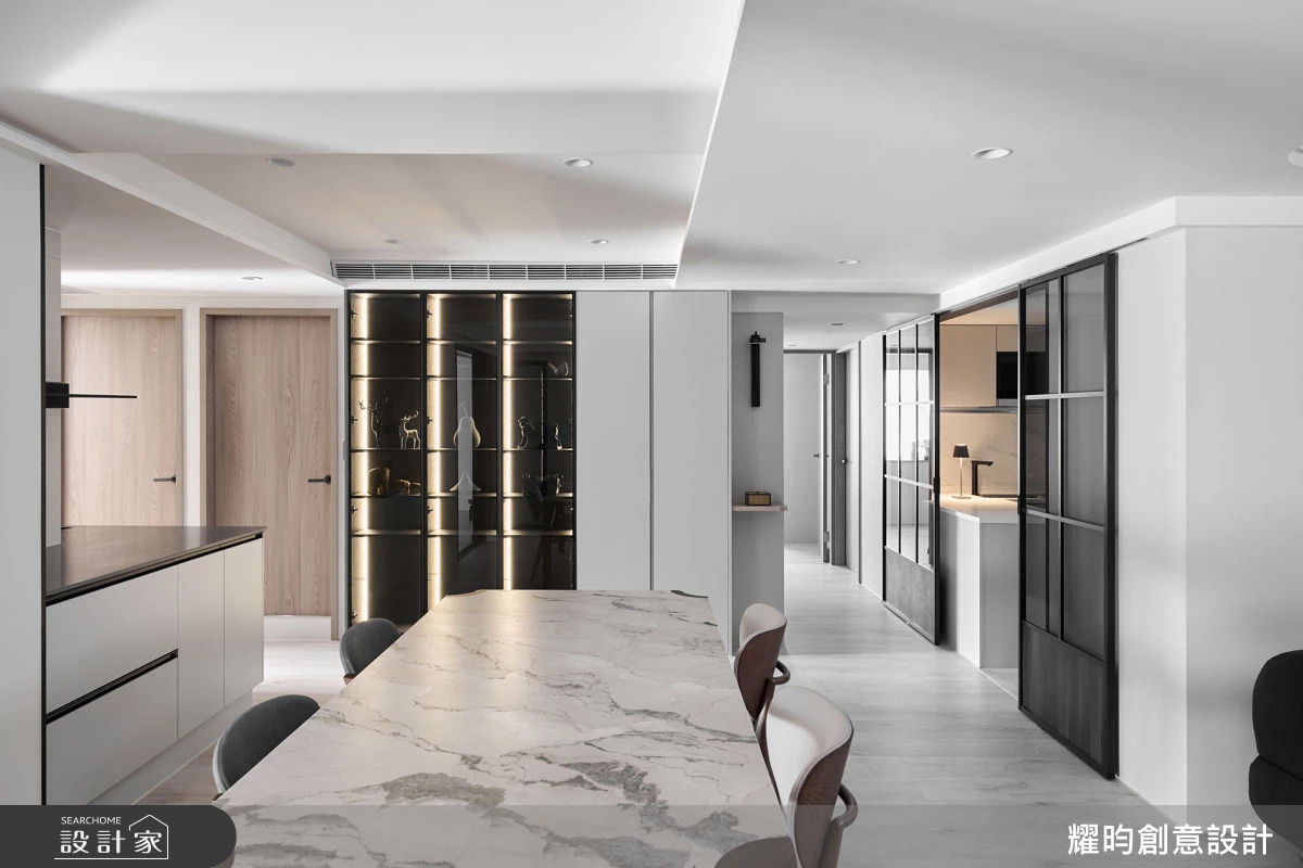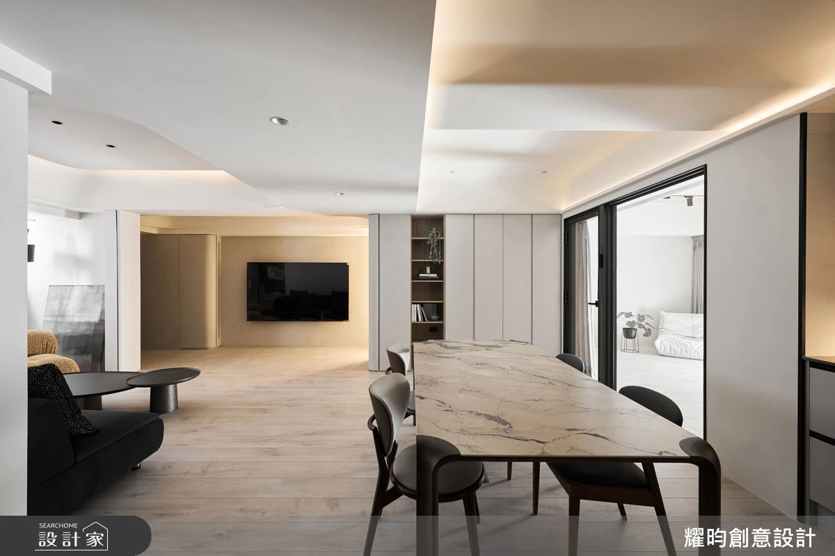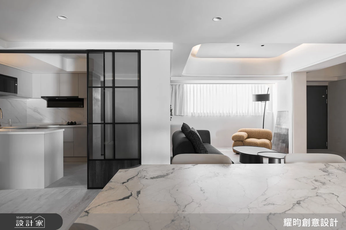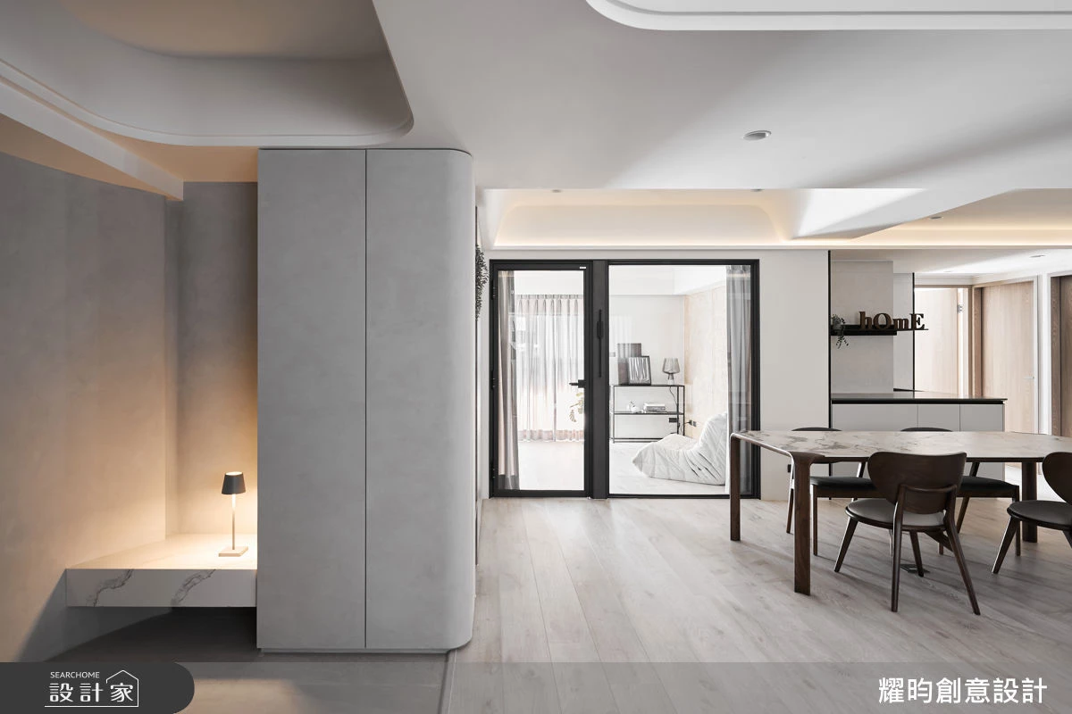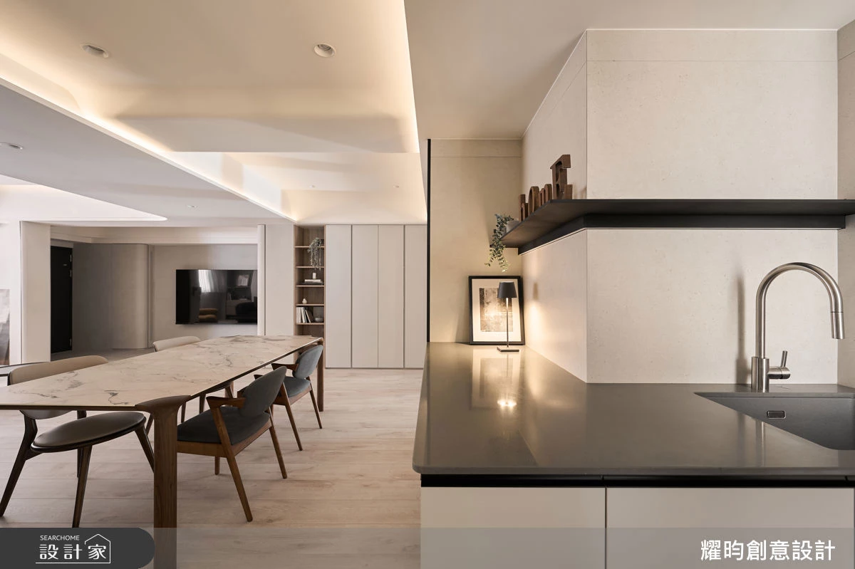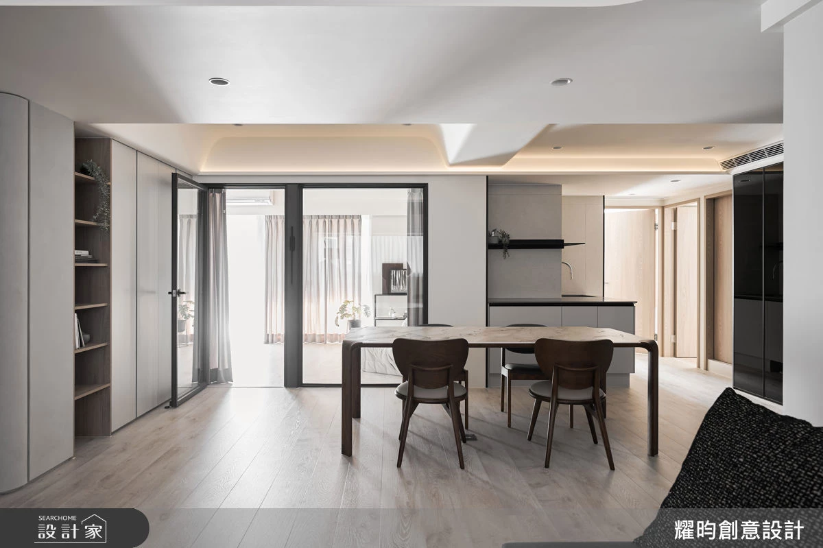 30 年老屋原始格局有著大量的閒置空間,內部格局也被分割得大小不一,在使用與規劃上窒礙難行,耀昀創意設計索性將全屋格局砍掉重塑,將原本客廳、廚房與臥室分配的位置重新規劃,透過環形排列讓每一間臥室都能保有充足採光,坪數上也儘可能做到舒適、得以妥善安排收納機能。公領域將廚房改為半開放式設計,玻璃拉門搭配中島的設計手法,讓廚房可以變成封閉或開放都可以的雙向運用。天花板因為樑柱多,為了不壓迫屋高又要修飾樑柱,在管線經過的區域才做包樑設計,透過高低天花保持舒適屋高,透過公領域的開放與自由動線,讓原本不到三米高的住宅也能擁有優越的空間感。