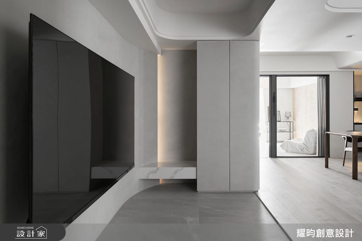 重塑格局後的玄關空間與電視主牆融為一體,設計師藉由弧形牆面消弭空間的隔斷感受,水泥塗料的鋪敘與灰色地磚鋪陳,統一色調的手法也讓空間更具整體性。電視牆的底端規劃成鞋櫃,大理石台度創造穿鞋椅,在弧形交界處加裝燈帶營造視覺亮點。