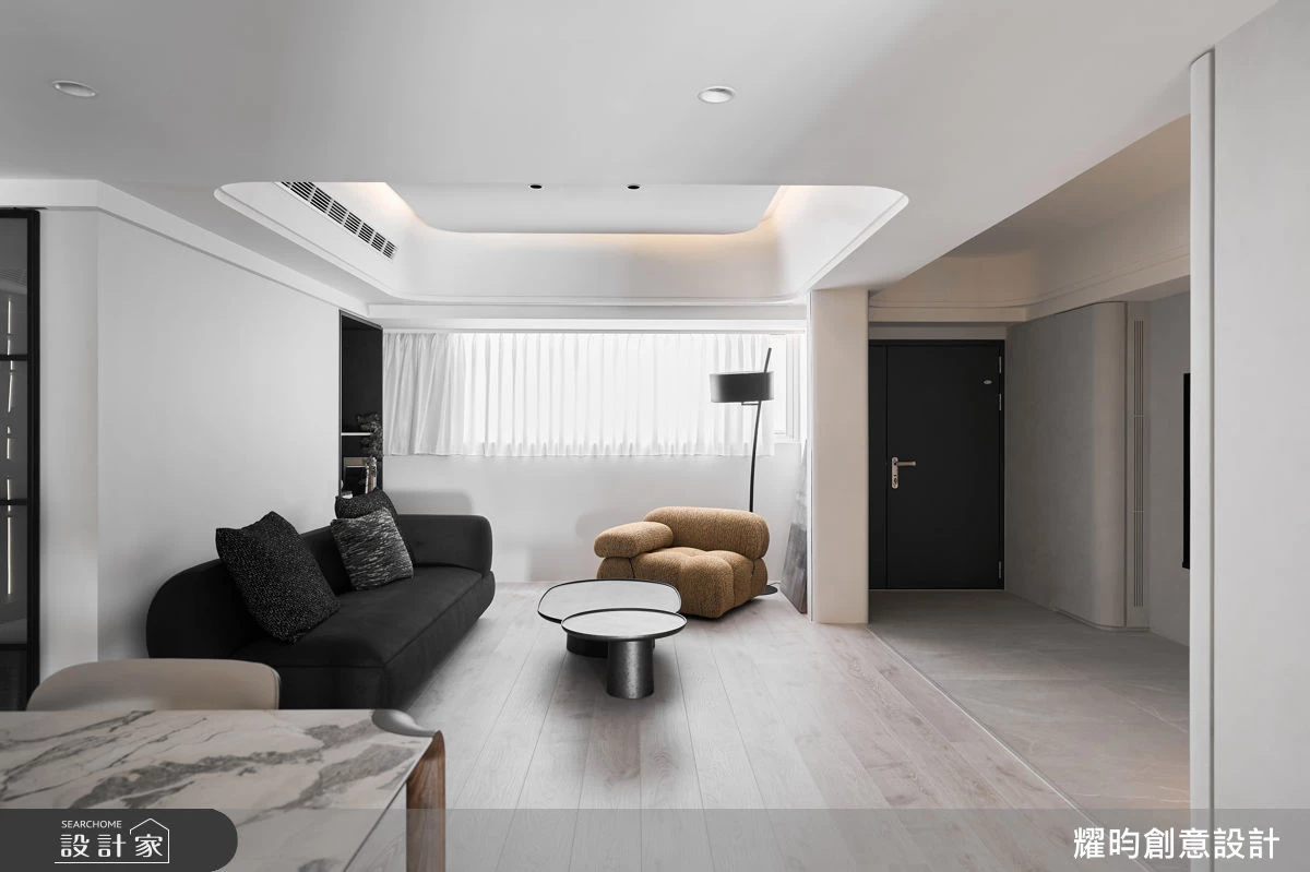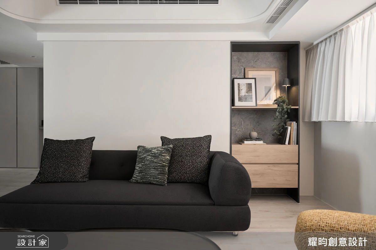 設計師將原本的餐廳區域改為客廳空間,玄關輕隔間創造出半包覆感的客廳外,位置編排也能擴大公領域的橫向尺度,從沙發到觀影區的深度也增加,可以搭配更大尺寸的電視螢幕也不顯壓迫。家具挑選上也跳脫常見的客廳配置,以設計沙發搭配單椅組合能自由調整家具位置,提升空間的靈活度;客廳天花板區域特別不做包樑延展屋高,並利用圓弧倒角和燈帶照明,搭配自然採光創造明亮舒適的休憩區域。沙發背牆的壁龕設計能置物也創造空間端景,讓平面化收納呈現簡潔的空間感。