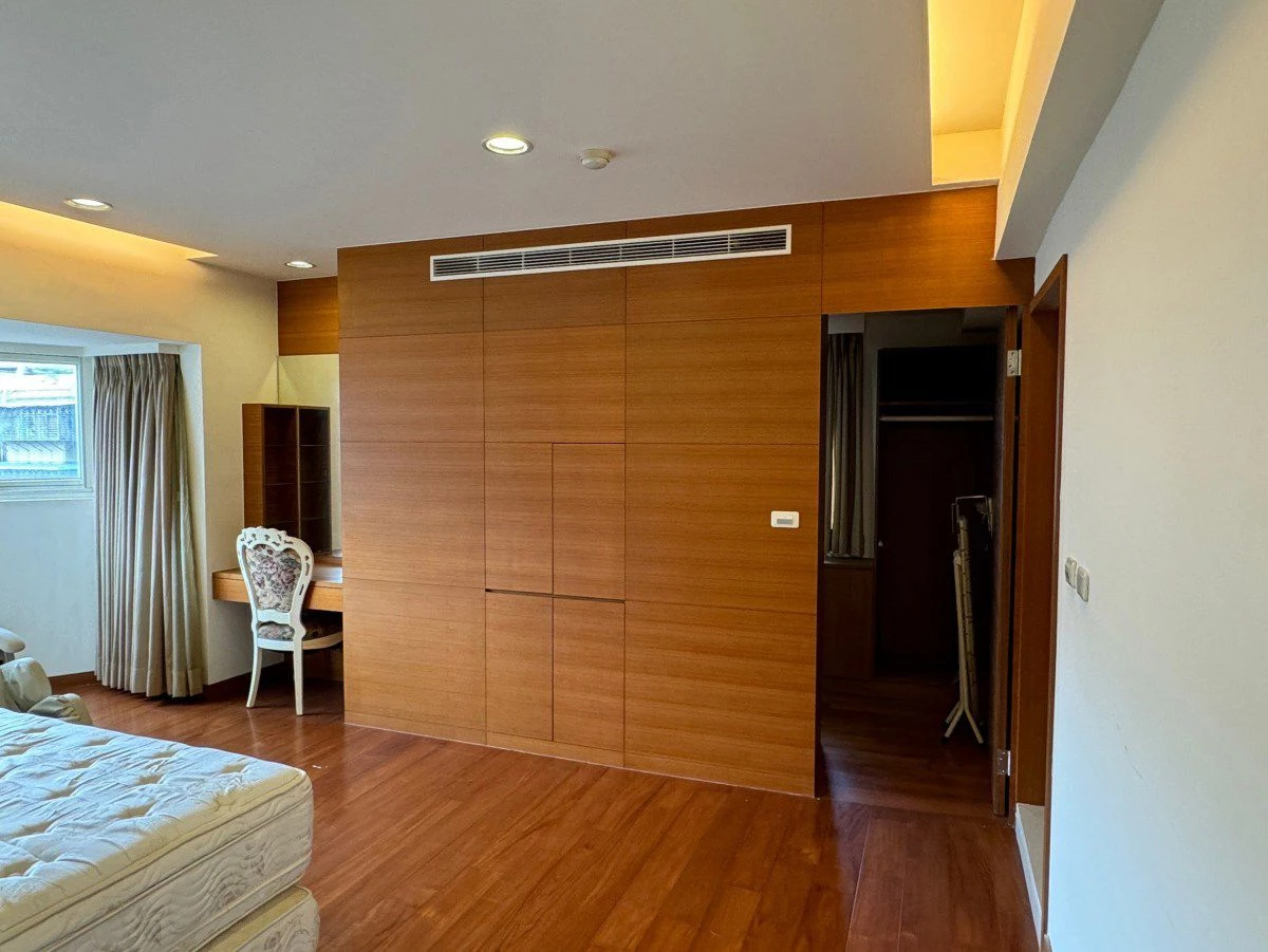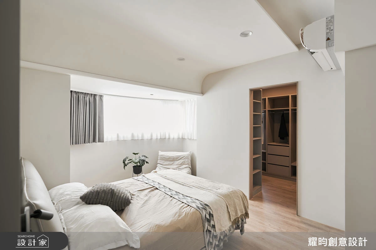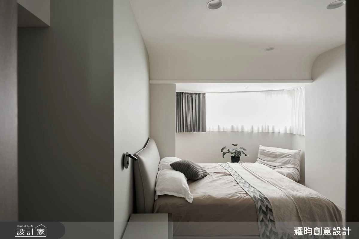 住宅內的3間臥室和一間視聽室有重新規劃成比例更為均衡的配置,避免過小或過大的臥室難以規劃。原本過大的主臥空間透過重塑隔間牆調整成恰當的比例,主臥擁有別緻的弧形外牆,正好可以打造成睡眠區以外的休憩空間,床尾維持原本的獨立更衣間配置,但稍微縮小成更為方正的格局,並利用隱藏門設計化解門扇截斷空間的問題。整體色調採取北歐輕爽簡約的白色,天花板與牆體注入弧形語彙,提升空間整體性,也讓住宅得以規劃另一間小主臥,讓人女主人可以依照各自生活作息、不相互干擾。