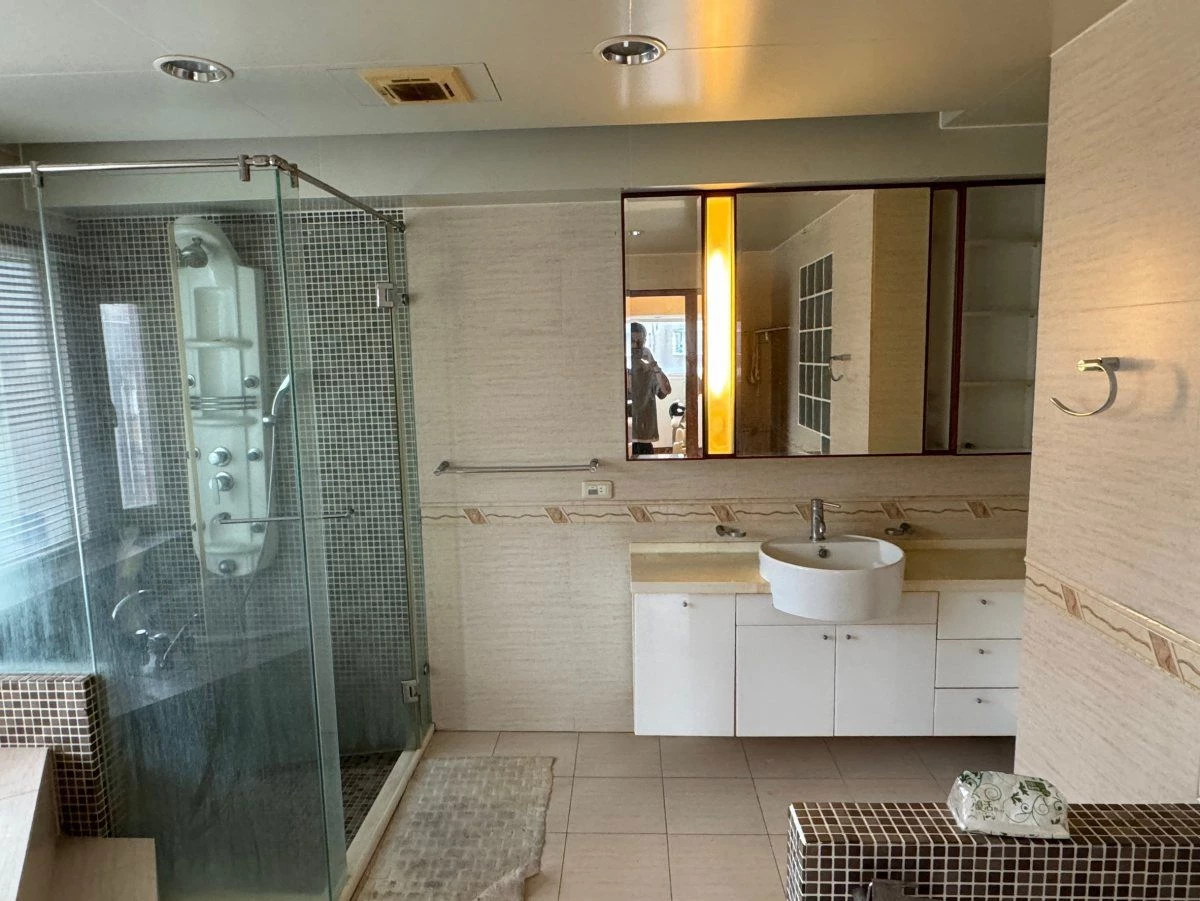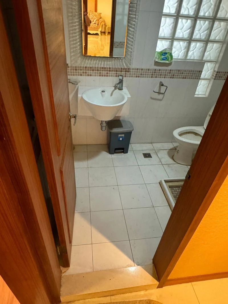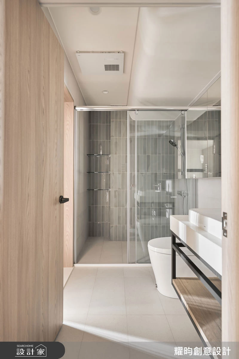 住宅內的2間衛浴同樣因為管線位置沒有進行位移,但在比例分配上同樣也進行重塑。主臥的衛浴除了內部防水重建、鋪貼磁磚與建構良好的乾濕分離動線外,別再設計了兩扇門,可以同時讓女主人房與其他空間共用衛浴空間,讓衛浴配置有更好的利用度。窄長型衛浴以一字型排列,淋浴間鋪貼翠綠色窯變地鐵磚,並在天花板安裝新風機,打造明亮舒適且乾燥的衛浴空間。