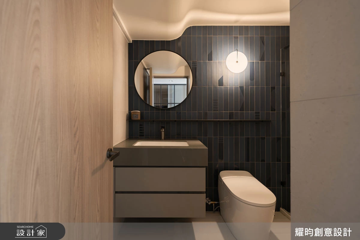 一旁的客浴空間將天地半材質全數剔除,同樣進行防水施作後,將牆面以淺色磁磚鋪敘,天花板做了曲線設計解決了管線經過的空間、同時降低整個平釘天花板造成的壓迫感。洗手台的牆面選用孔雀綠窯變地鐵磚,在色彩上呼應主浴;牆面的圓形壁燈與圓形浴鏡則呼應天花板的流線造型,將原本紊亂老舊的衛浴空間改變為北歐簡約時尚的氛圍。