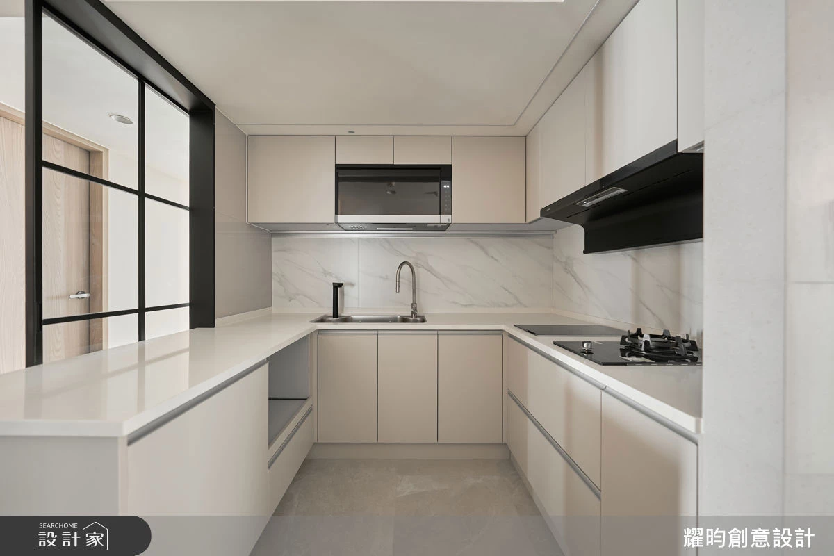考量到下廚時產生的油煙問題,耀昀創意設計維持廚房空間的封閉,但利用玻璃拉門取代實牆隔間,擴大廚房入口與視覺通透性,用玻璃拉門搭配中島的設計手法,讓廚房成為可封閉或開放的雙向設計。廚具選擇L型搭配一座中島構成ㄇ字型廚房,建構出爐台、水槽與中島的黃金三角動線,提升整體料理動線外,中島的加入也可以讓廚房跨場域運用,成為一個輕鬆便利的輕食吧台。